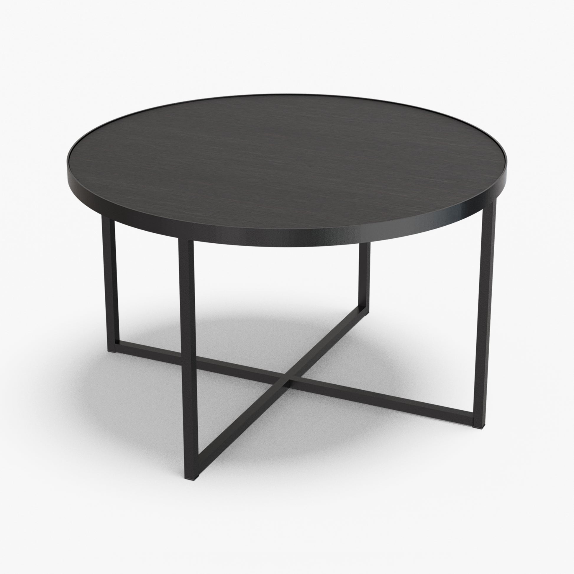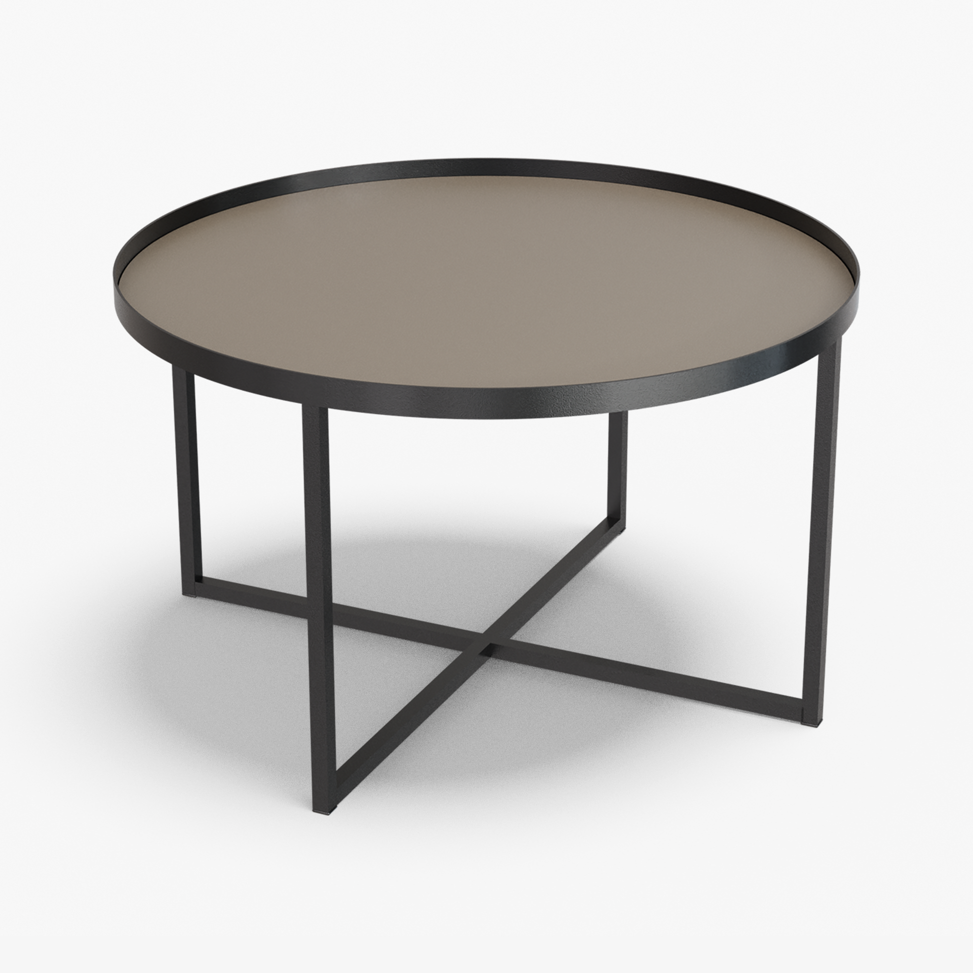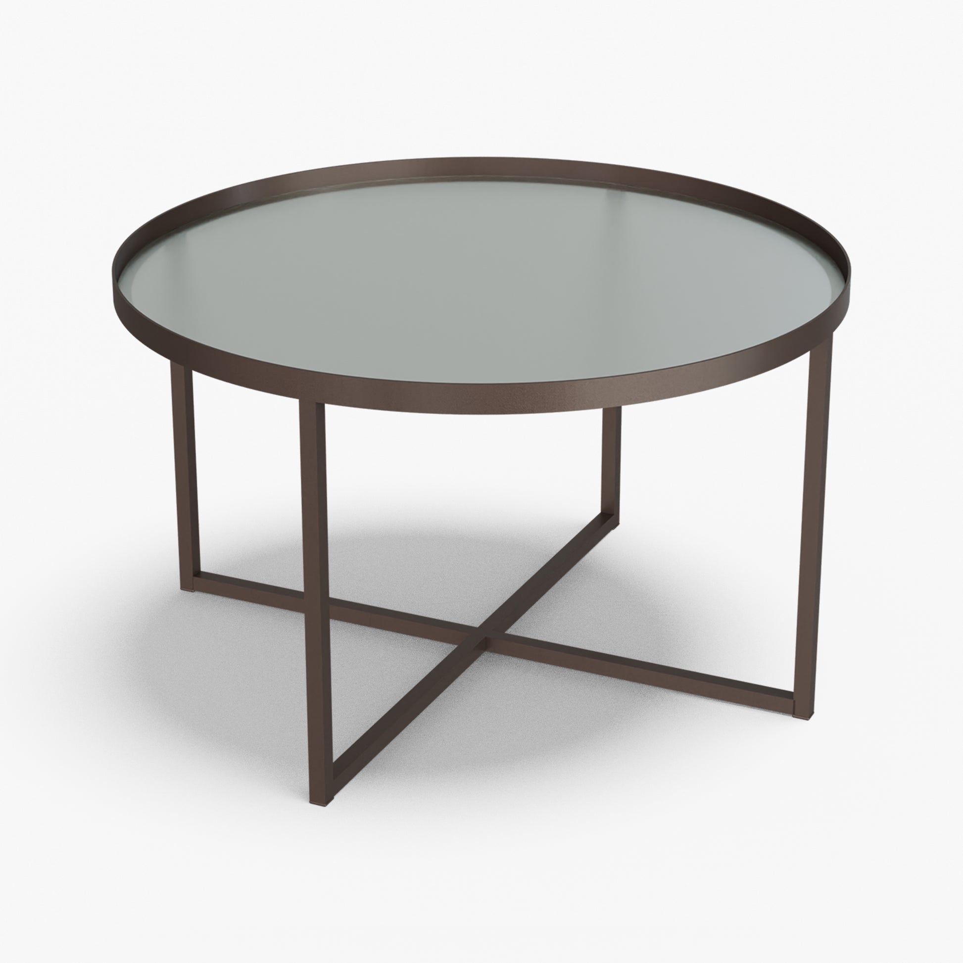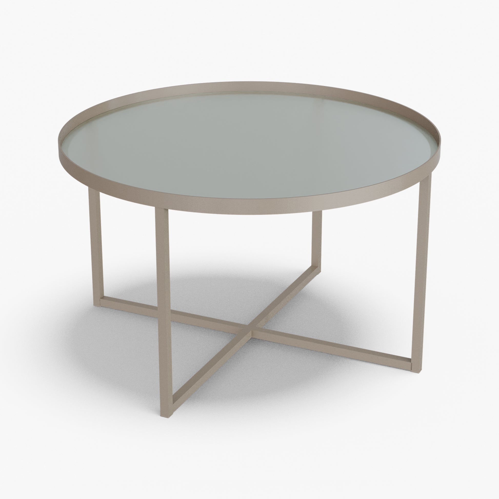 Cross balances clarity and structure. A round, tray-style top sits inside a slim steel rim, giving the table a calm, modern presence while keeping the surface visually light. Below, a powder-coated steel base forms a clean X-stretcher that locks the frame for stability without adding bulk. The result is a sturdy, easy to live with piece that pairs well with both soft textiles and modern interiors.