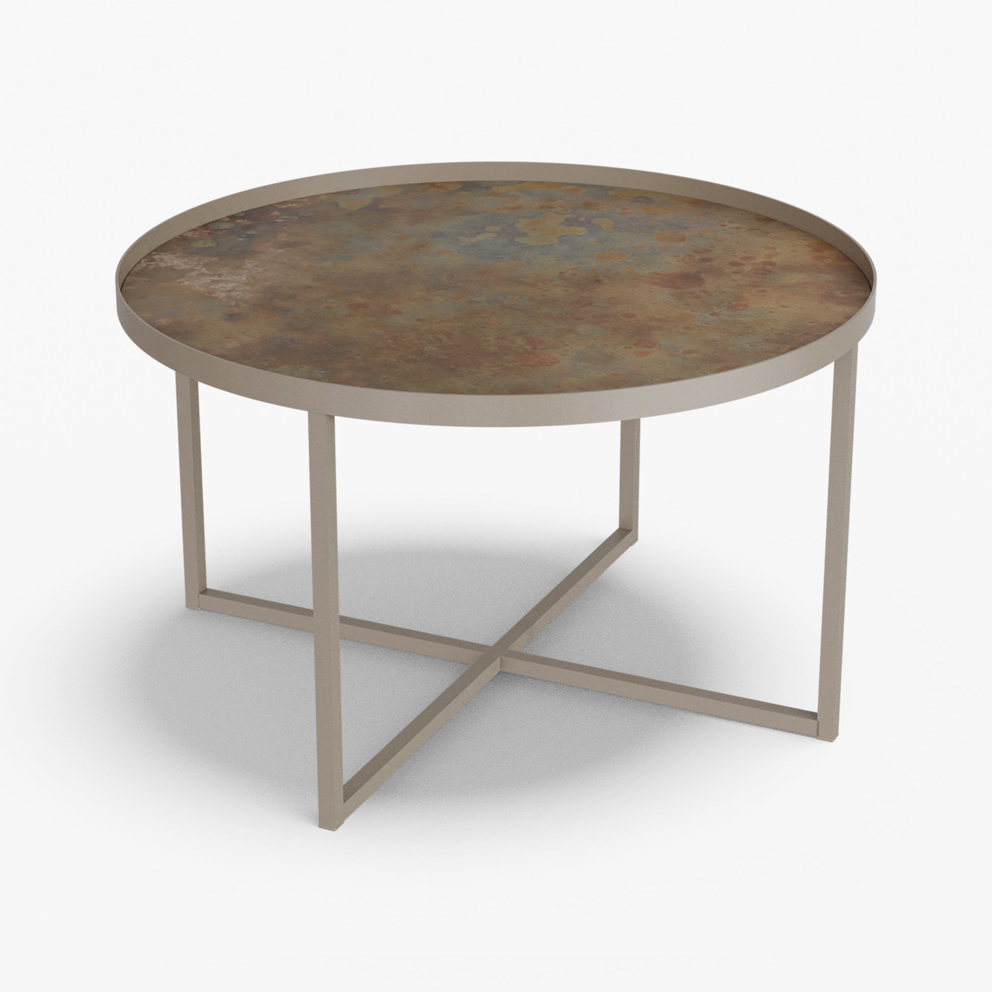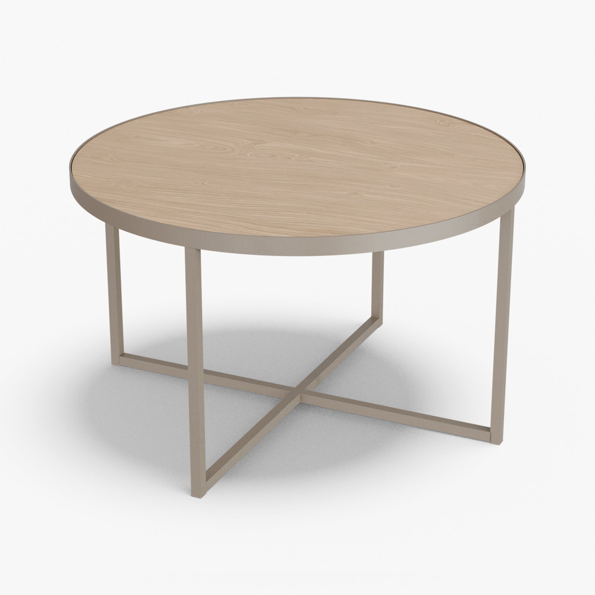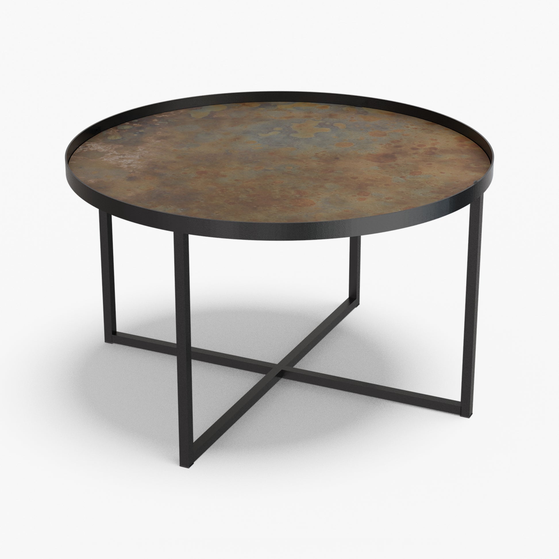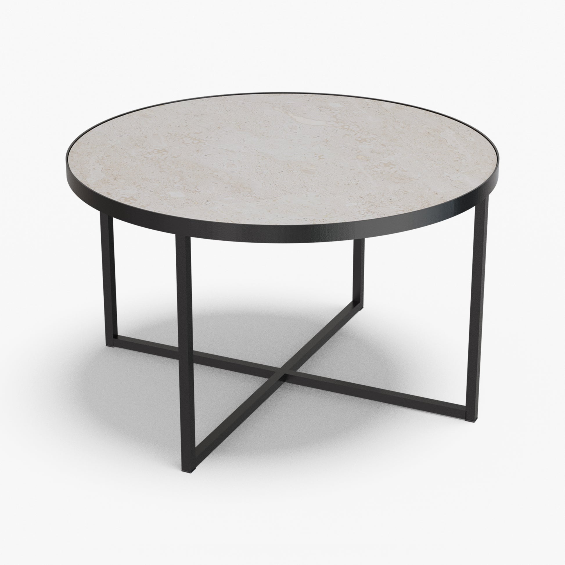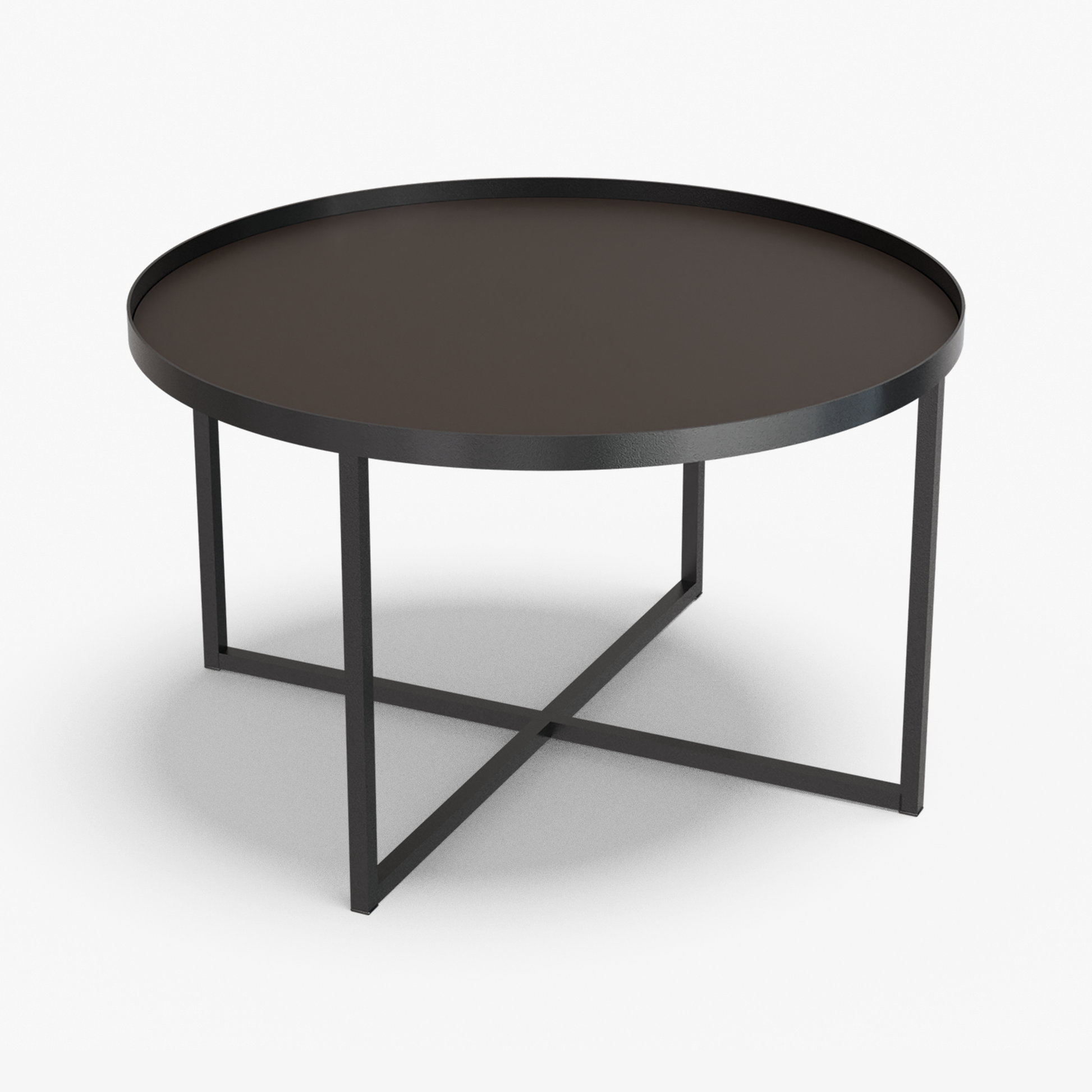 Cross balances clarity and structure. A round, tray-style top sits inside a slim steel rim, giving the table a calm, modern presence while keeping the surface visually light. Below, a powder-coated steel base forms a clean X-stretcher that locks the frame for stability without adding bulk. The result is a sturdy, easy to live with piece that pairs well with both soft textiles and modern interiors.