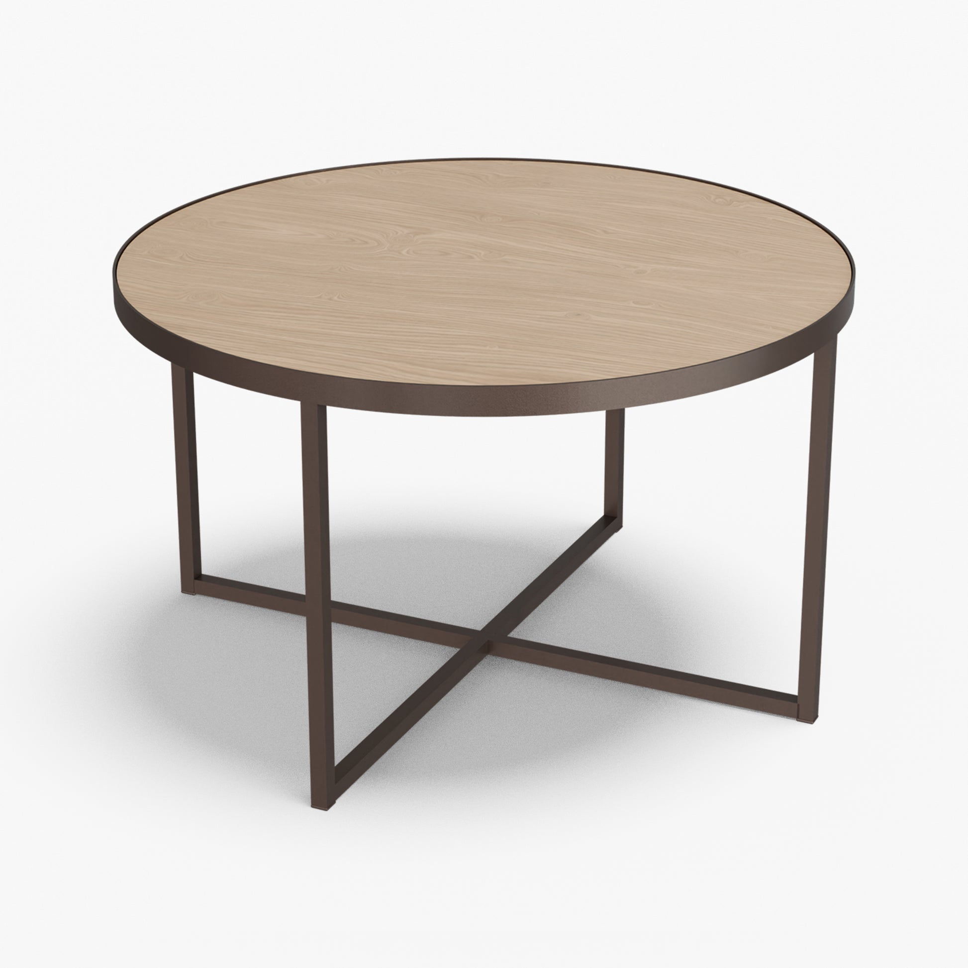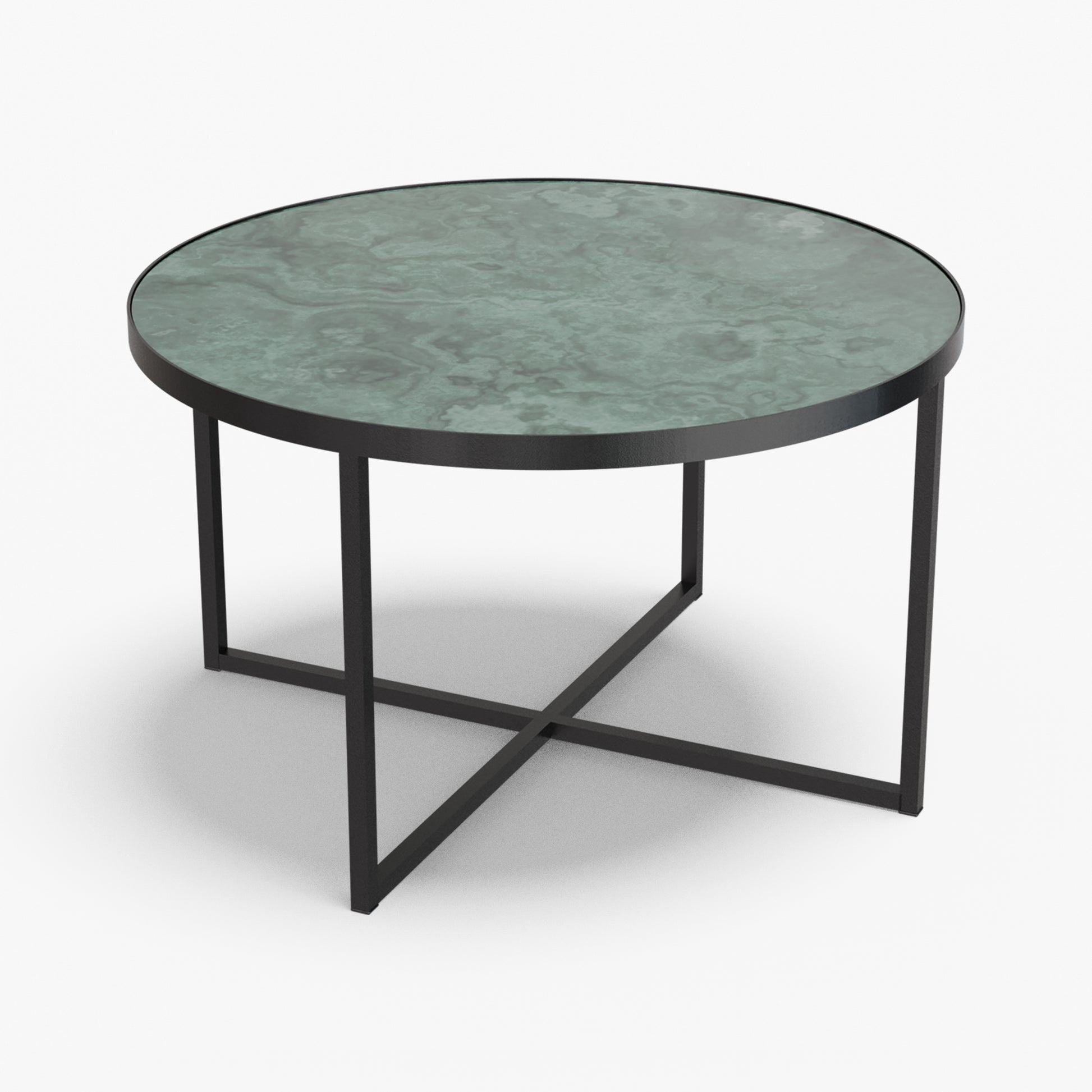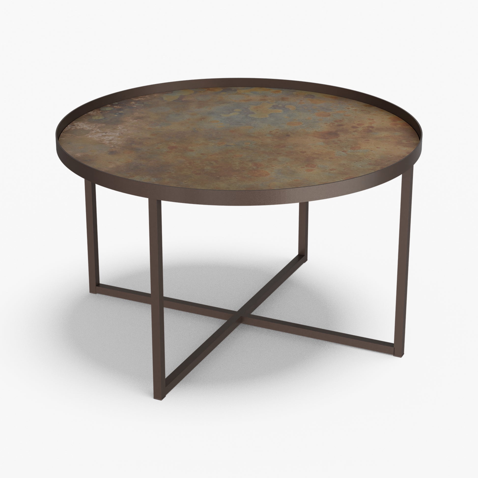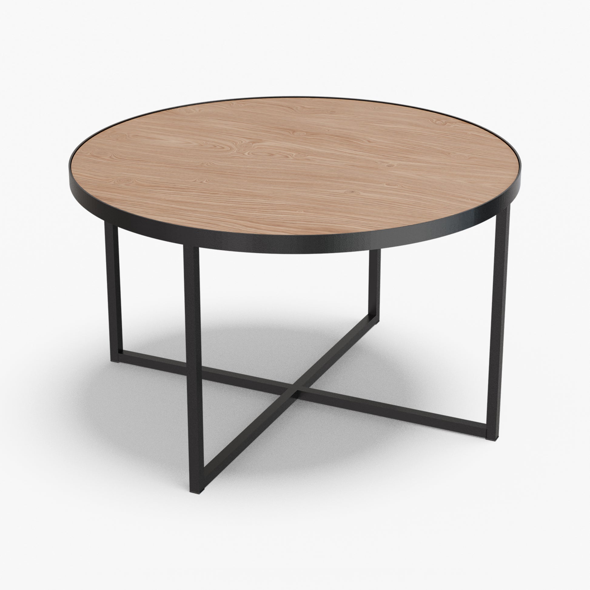Cross balances clarity and structure. A round, tray-style top sits inside a slim steel rim, giving the table a calm, modern presence while keeping the surface visually light. Below, a powder-coated steel base forms a clean X-stretcher that locks the frame for stability without adding bulk. The result is a sturdy, easy to live with piece that pairs well with both soft textiles and modern interiors.