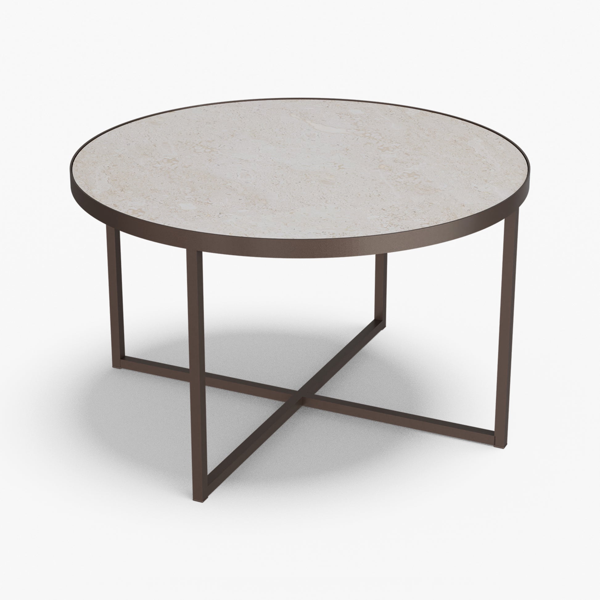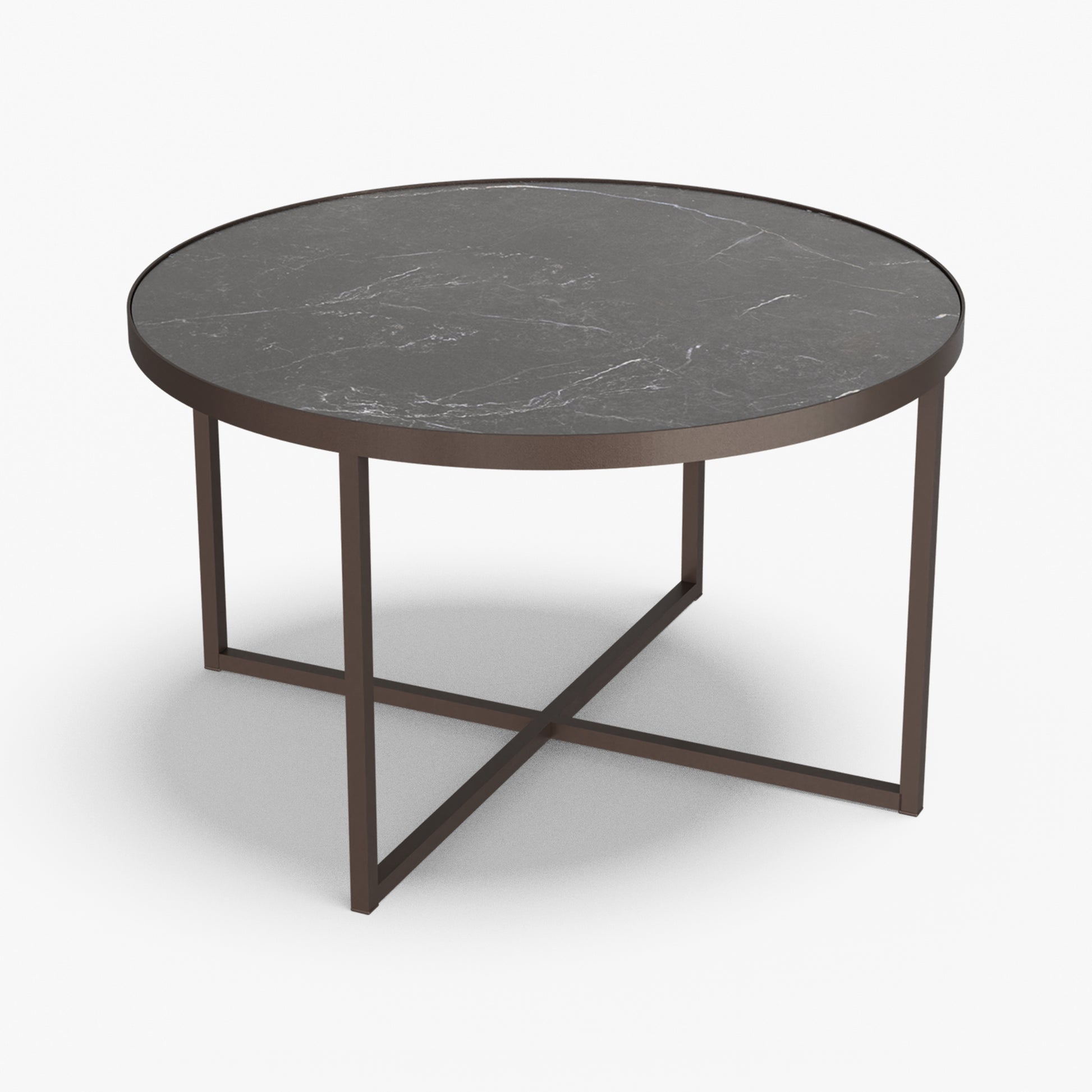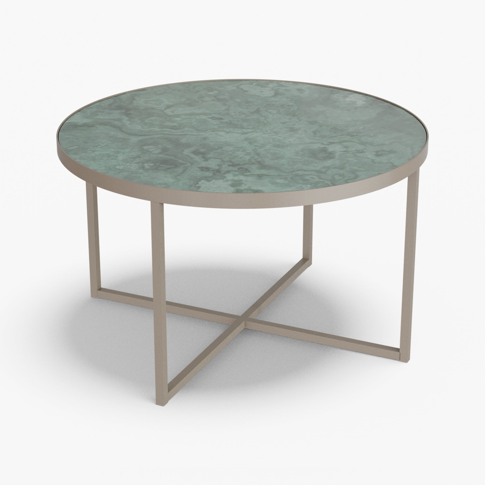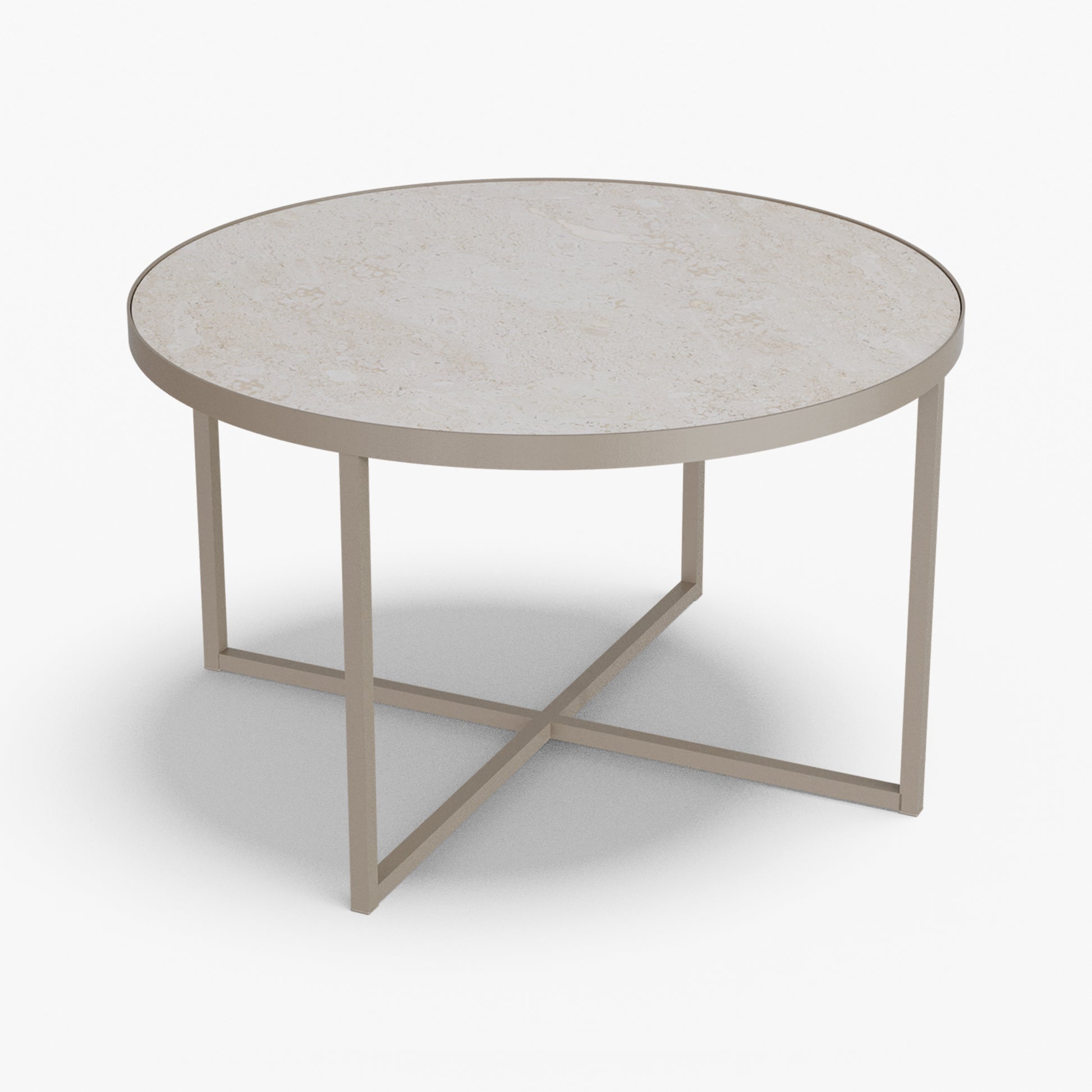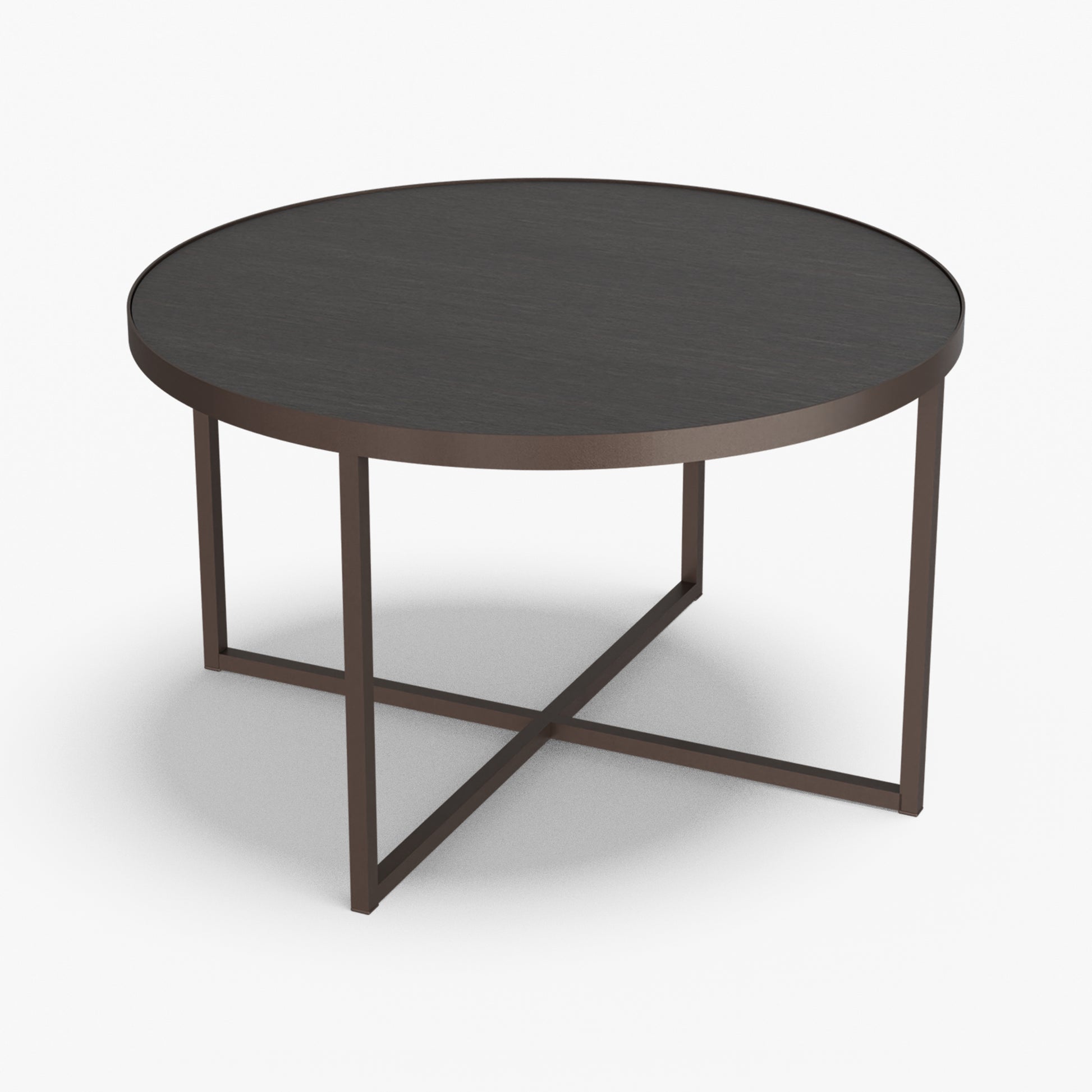 Cross balances clarity and structure. A round, tray-style top sits inside a slim steel rim, giving the table a calm, modern presence while keeping the surface visually light. Below, a powder-coated steel base forms a clean X-stretcher that locks the frame for stability without adding bulk. The result is a sturdy, easy to live with piece that pairs well with both soft textiles and modern interiors.