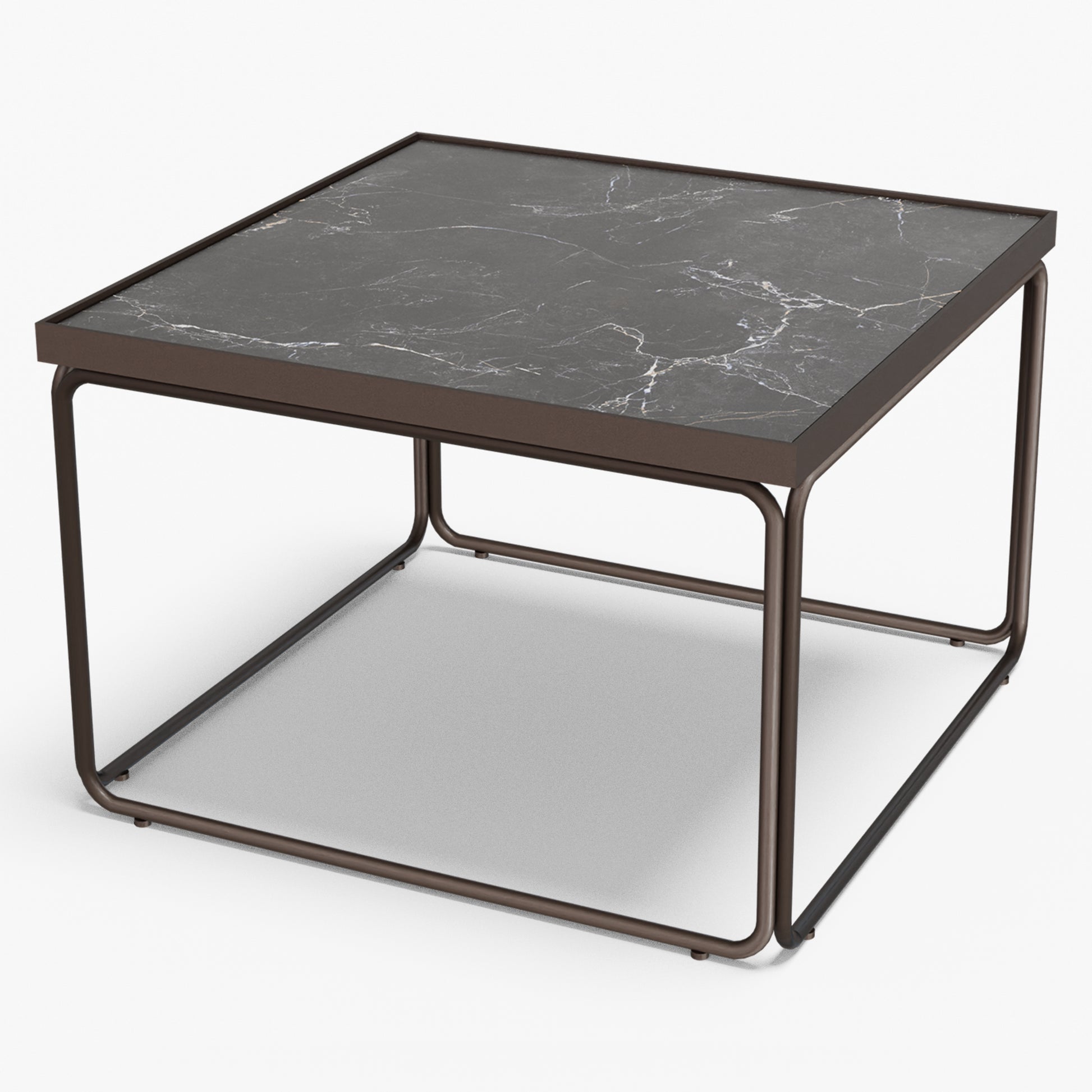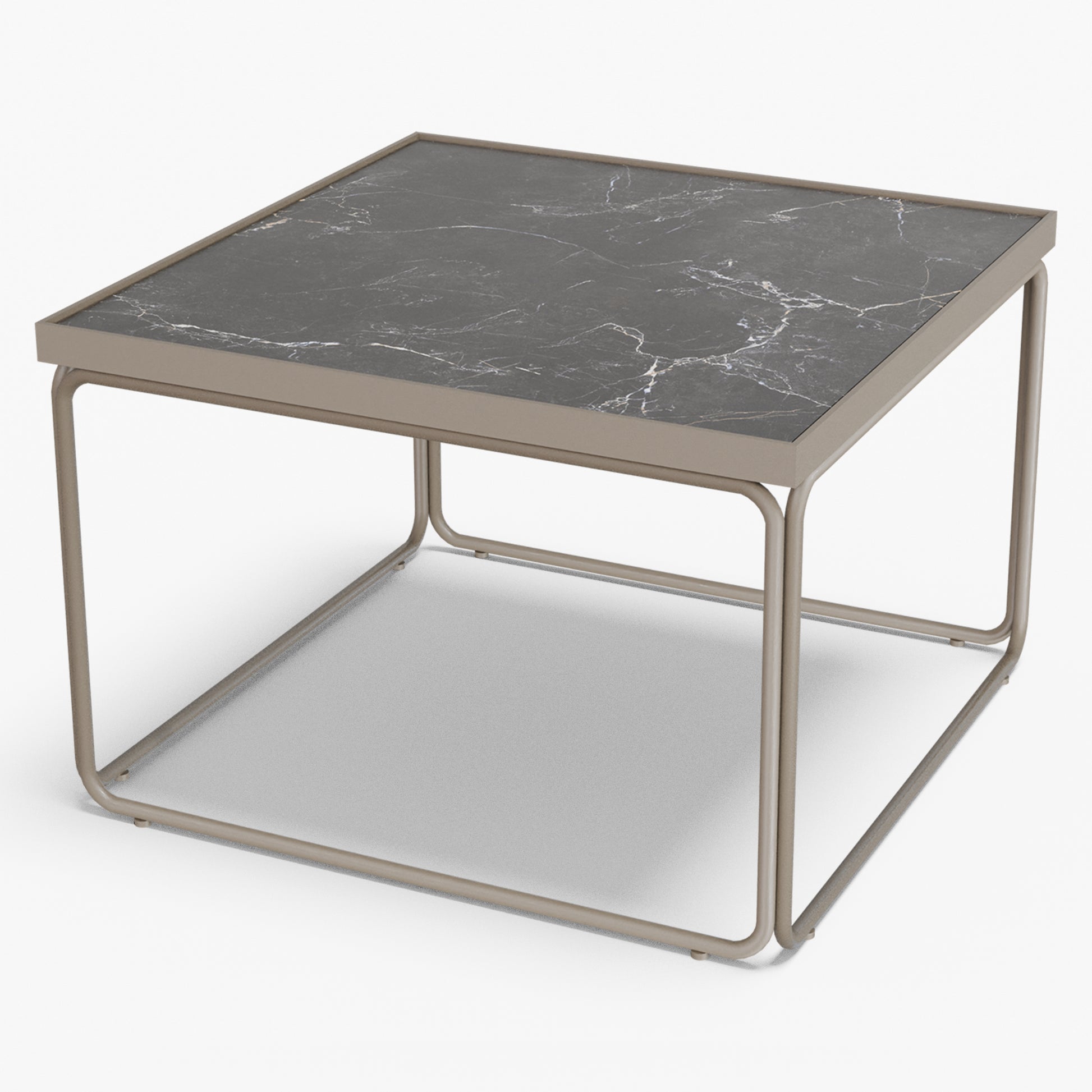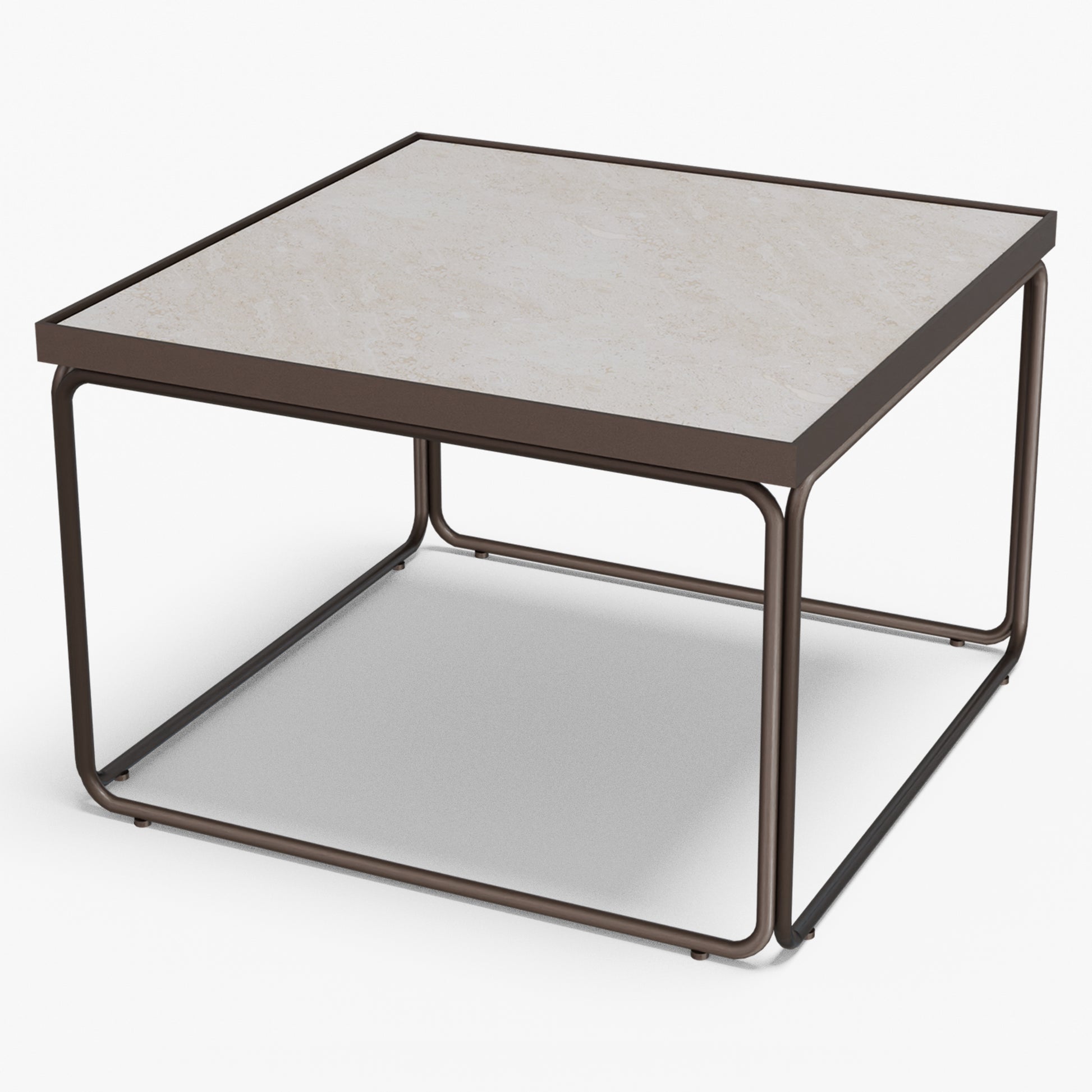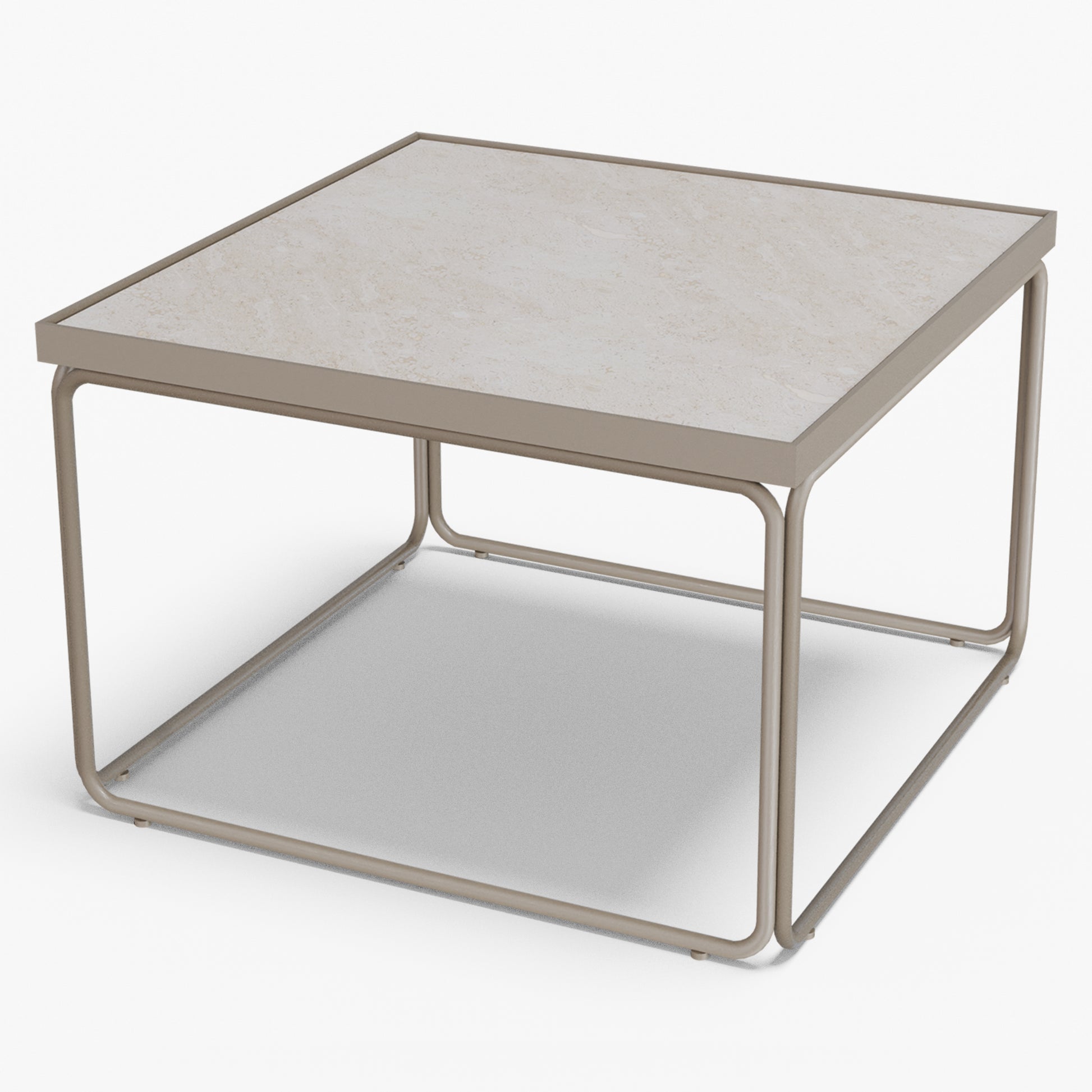 Rounded softens a square silhouette with gentle, radius corners and an airy tube-steel frame. A slim metal rim crisply frames the stone top, while protecting the edge for everyday use. The continuous, rounded base keeps sightlines open and gives the table a light look with confident stability. Built to last, the frame is welded steel finished in powder coat (a tough, baked-on layer that resists chips and scratches). Discreet floor glides protect your surfaces and make repositioning easy. The surface wipes clean in seconds use one as a compact centerpiece or pair two for a larger setting without visual clutter.