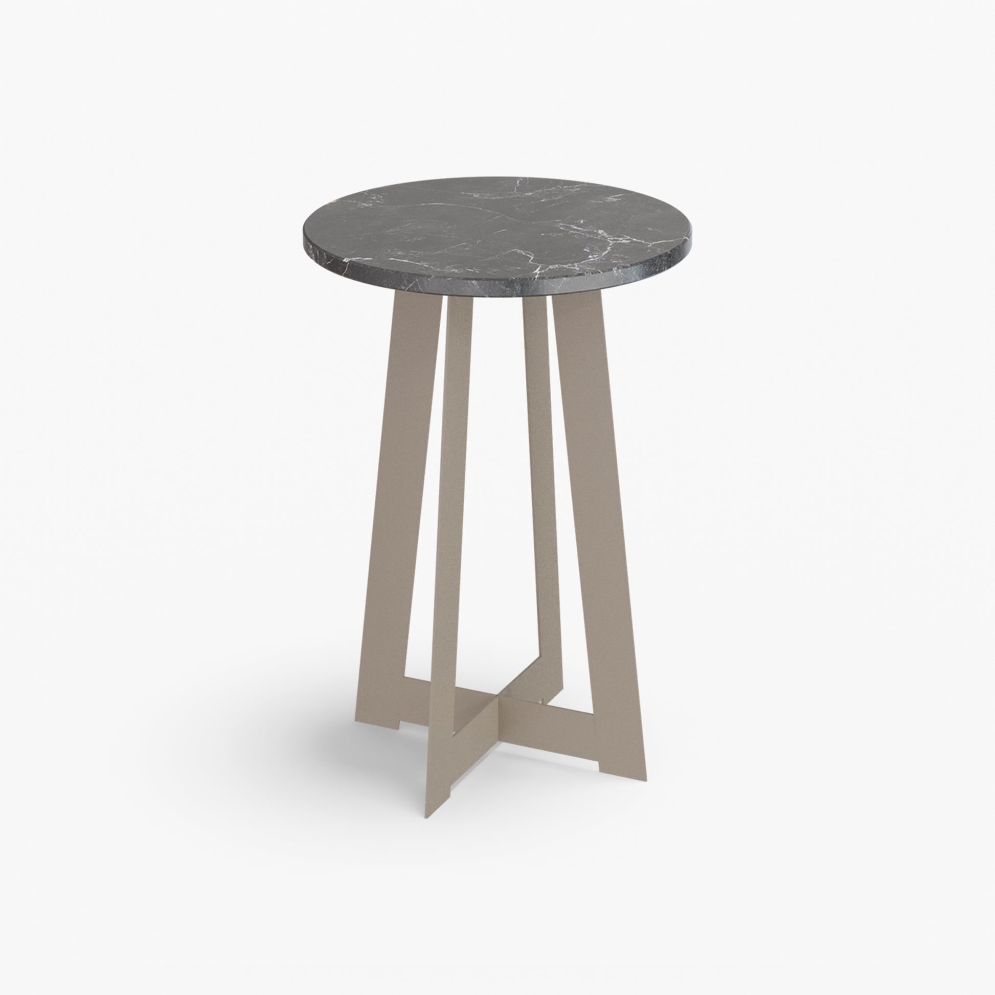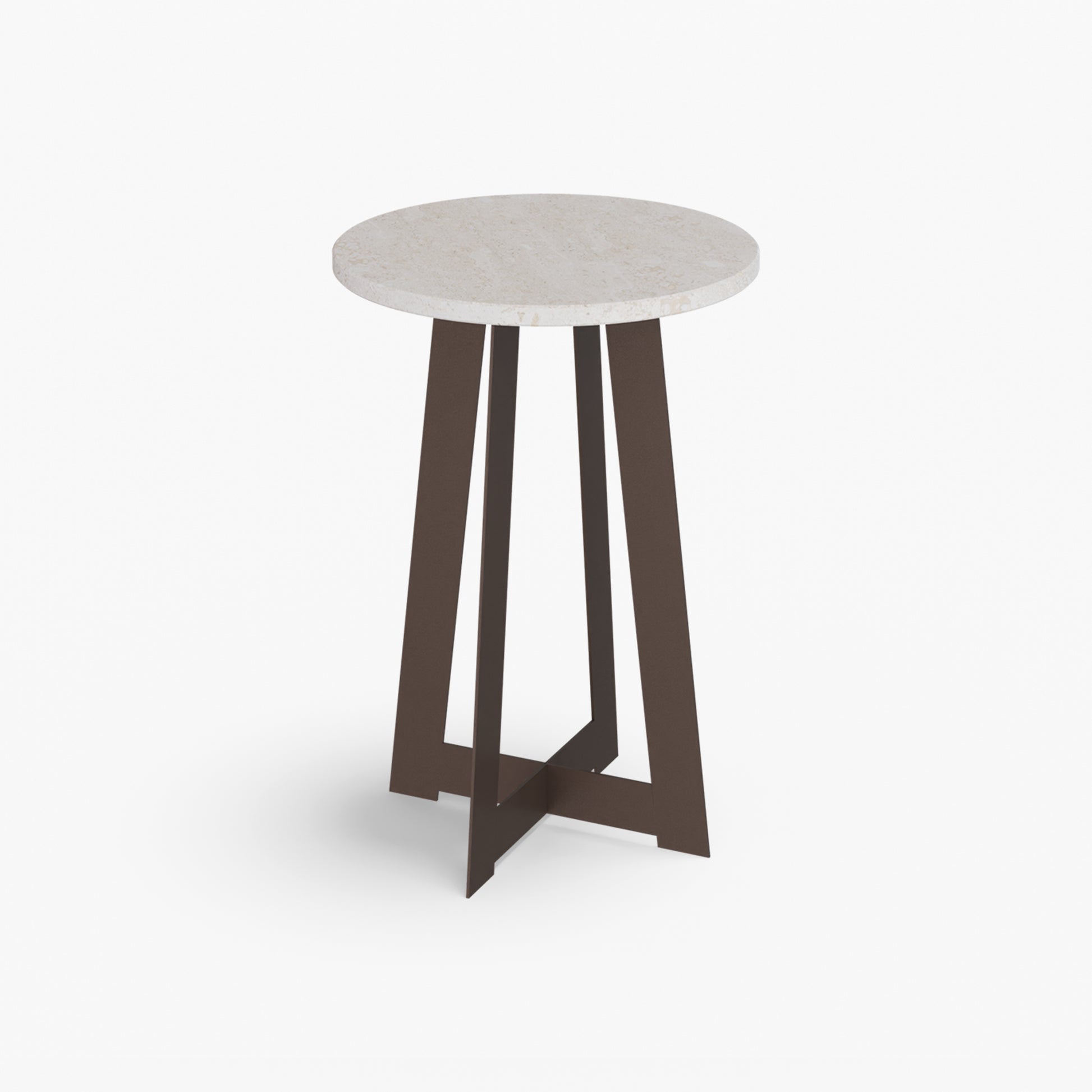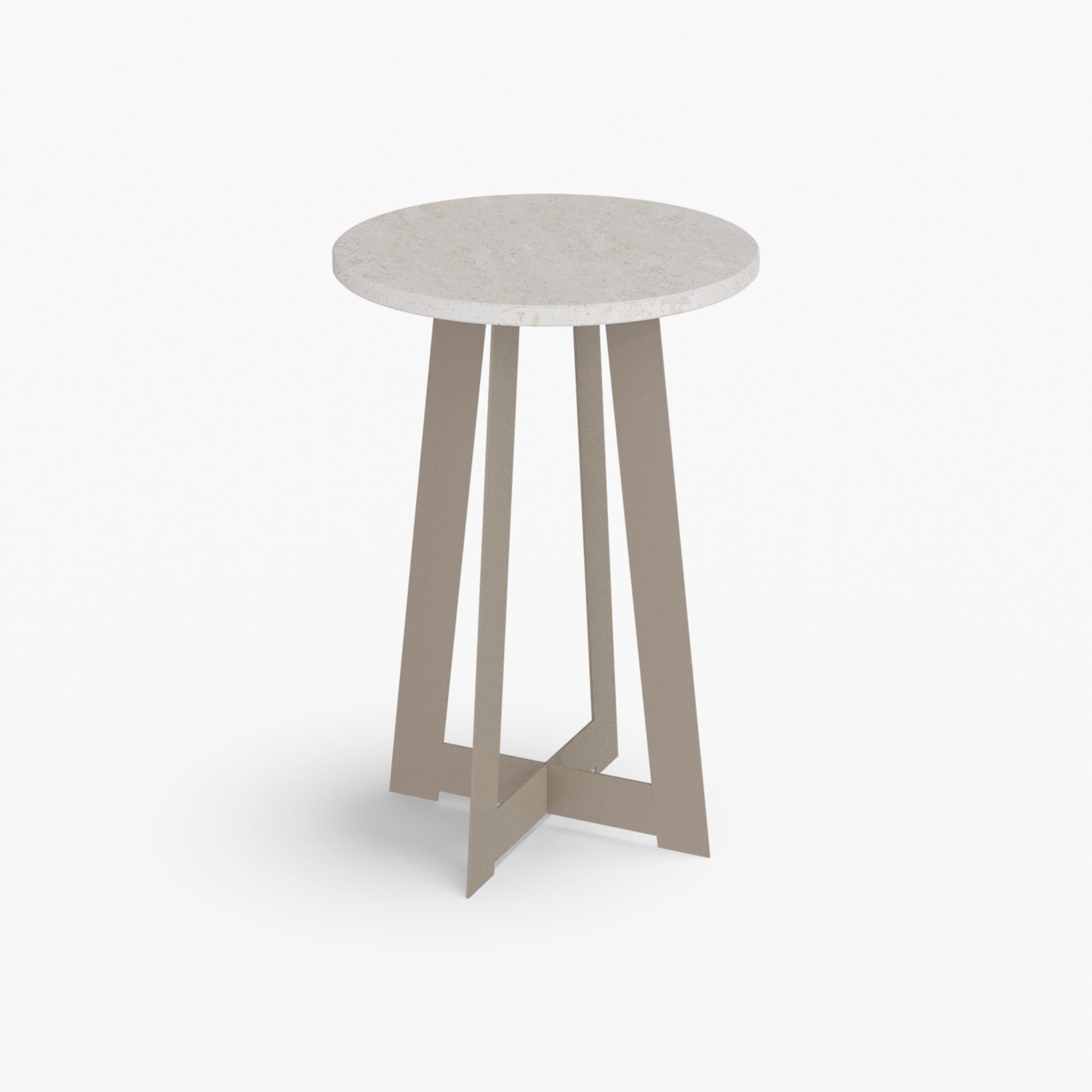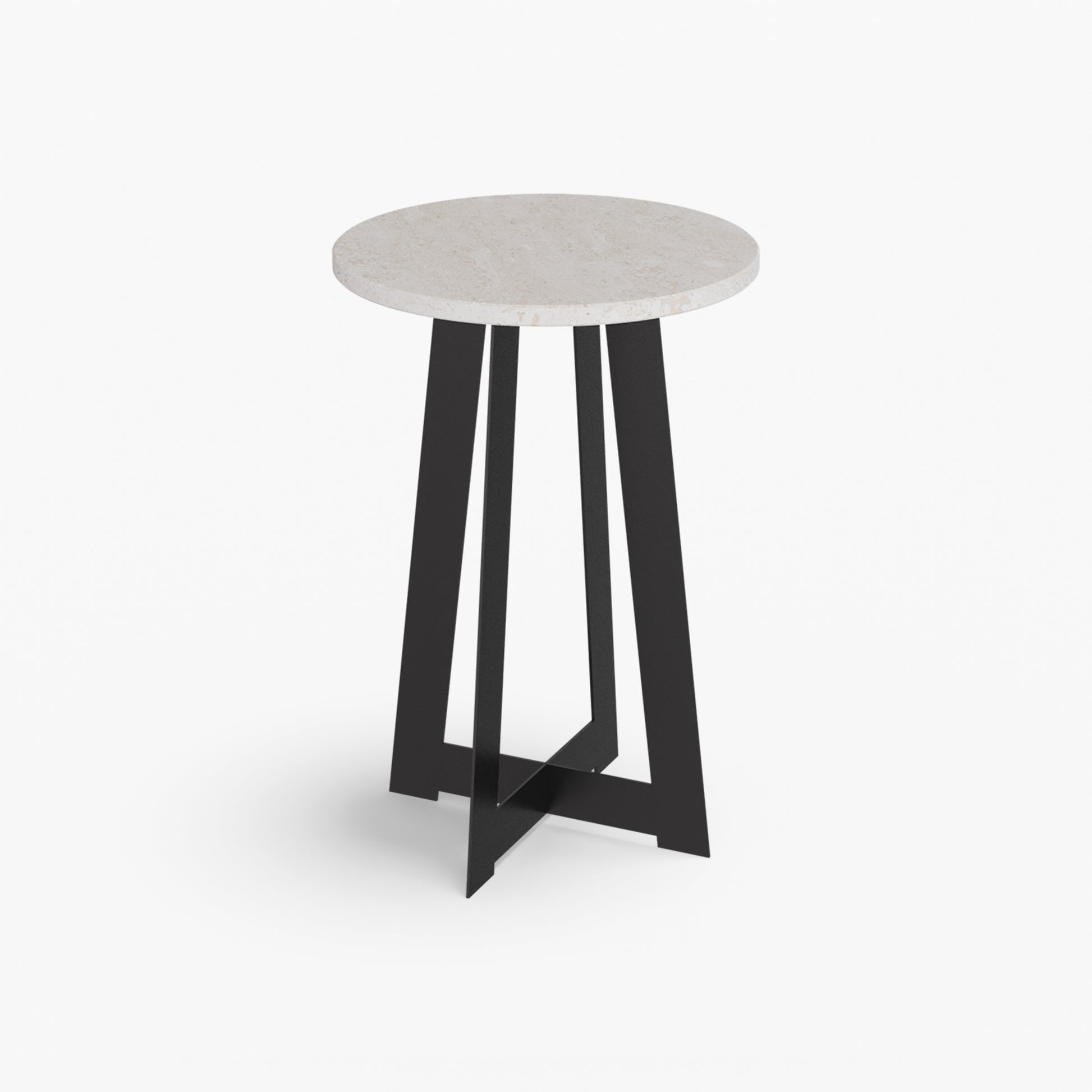 Triangle Round balances a soft, round top with a crisp, architectural base. The top’s natural shape looks sleek, while a slim steel rim keeps the edge clean and refined. Below, three splayed legs meet in a triangular frame, giving the table a light look and excellent stability without visual bulk. Built for everyday living, the base is welded steel with a powder-coat finish (a tough, baked-on layer that resists chips and scratches). Discreet floor glides protect your surfaces and make repositioning easy. The sealed stone surface wipes clean in seconds style it with a tray or let the geometry take center stage.