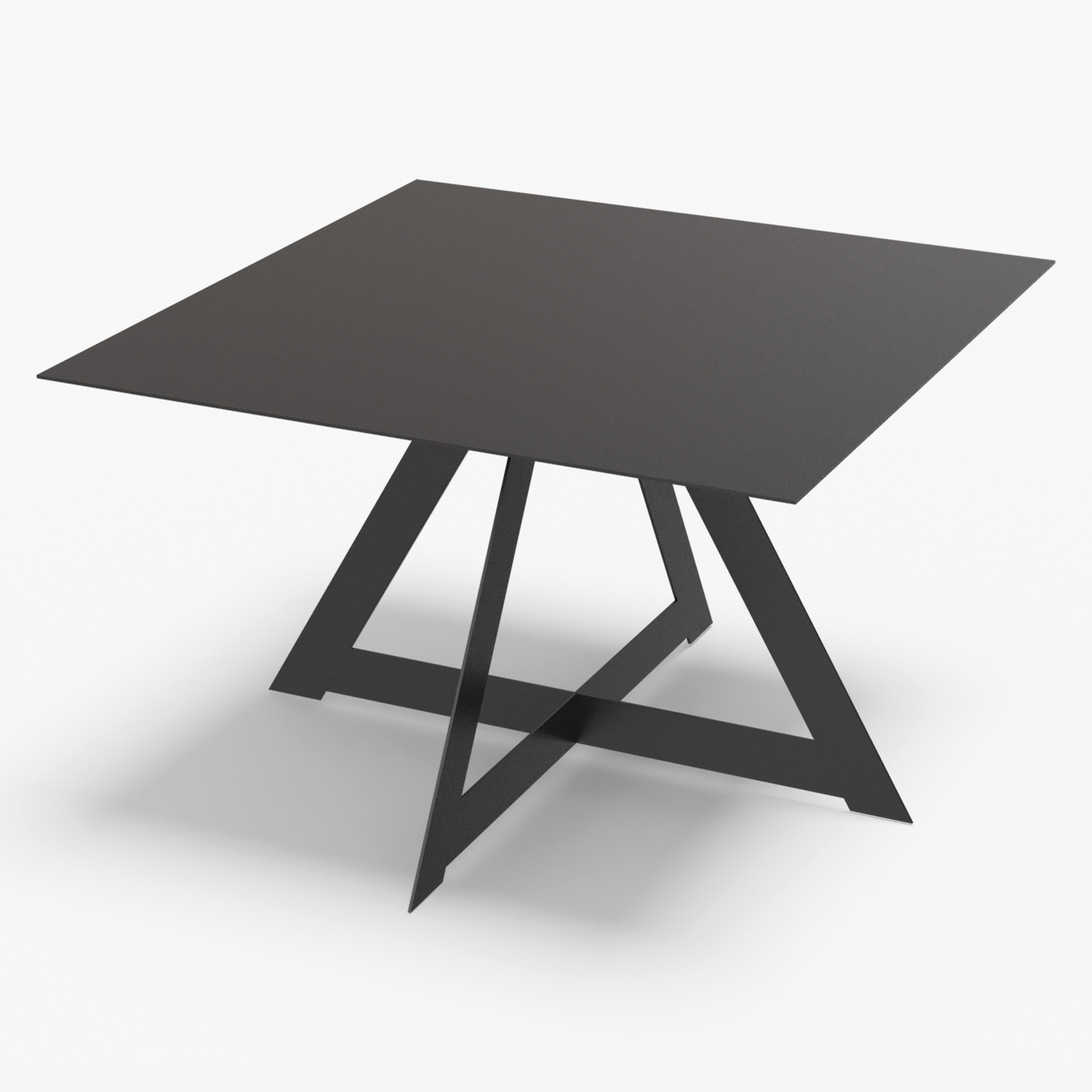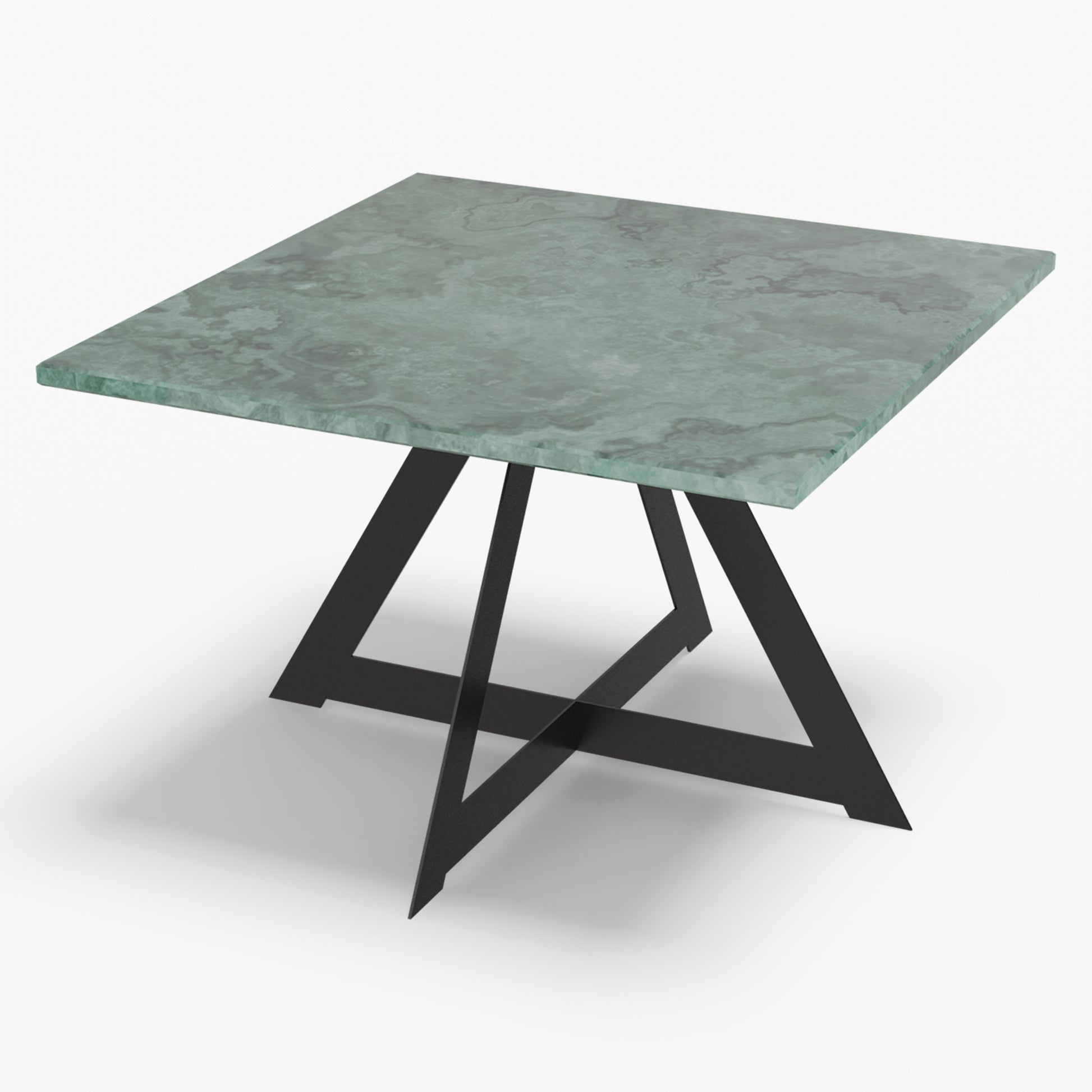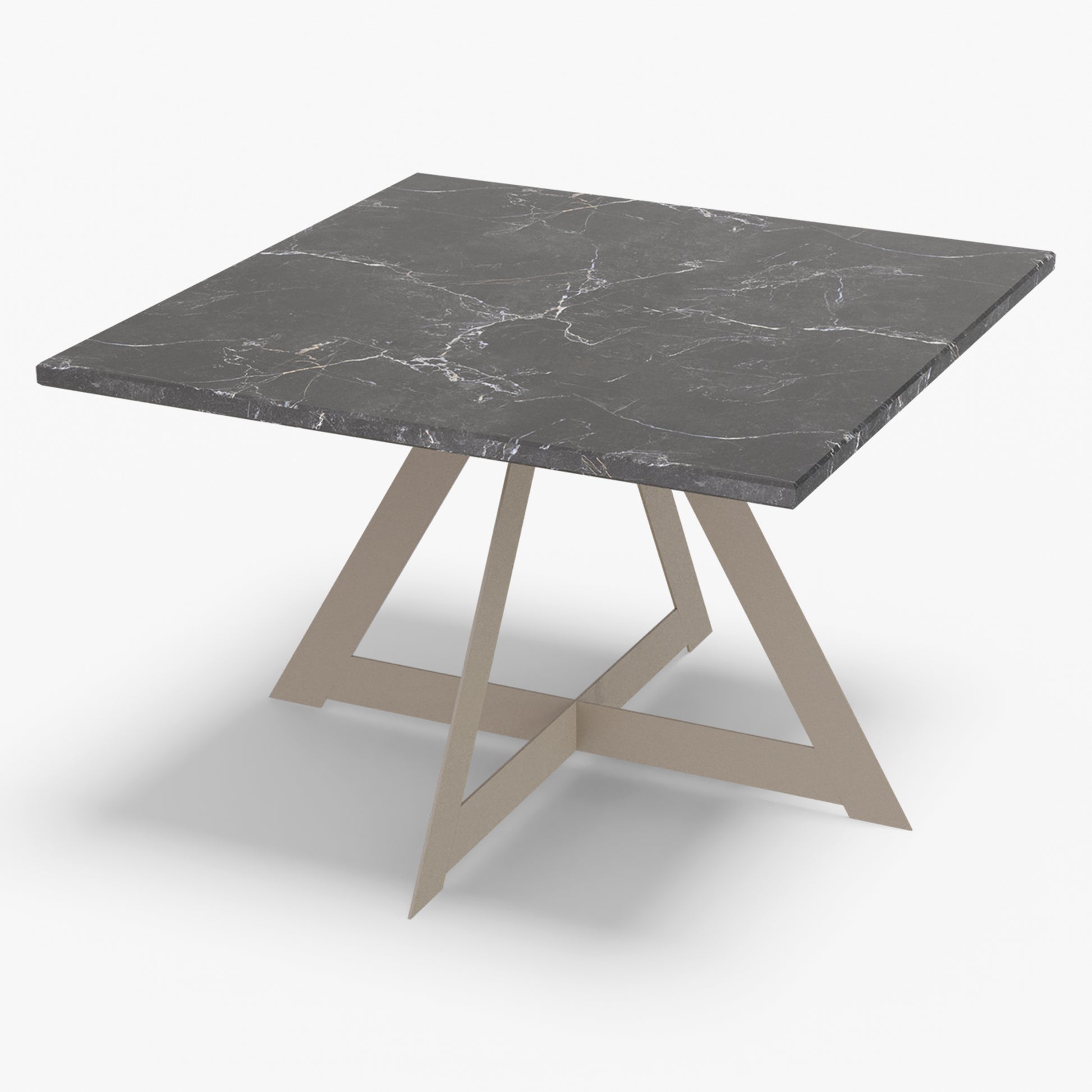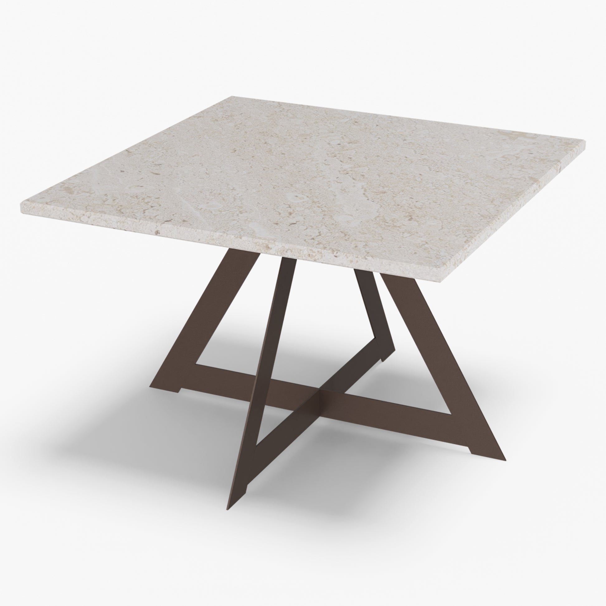 Triangle Square balances a soft, square top with a crisp, architectural base. The top’s natural shape looks sleek, while a slim steel rim keeps the edge clean and refined. Below, three splayed legs meet in a triangular frame, giving the table a light look and excellent stability without visual bulk. Built for everyday living, the base is welded steel with a powder-coat finish (a tough, baked-on layer that resists chips and scratches). Discreet floor glides protect your surfaces and make repositioning easy. The sealed stone surface wipes clean in seconds style it with a tray or let the geometry take center stage.